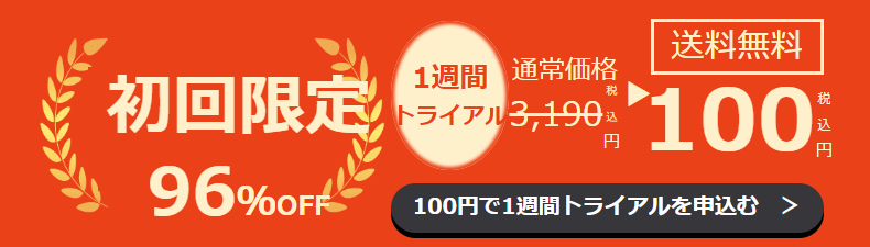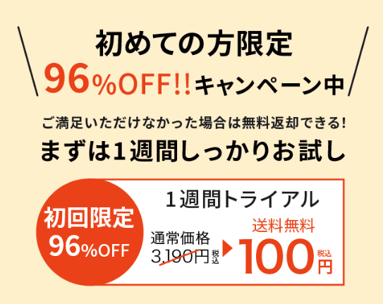 満足できなかかった場合は無料返却できる、初めての方限定の96%OFFキャンペーン実施中です。